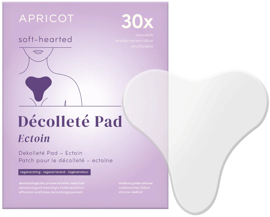 Az APRICOT Ectoin dekoltázs tapasz segítségével a száraz dekoltázs bőr ápolható. Orvosi szilikonból készült, és természetes ektoinnal dúsított, amely simítja a ráncokat és vonalakat. A tapasz akár 30 alkalommal is újrafelhasználható.