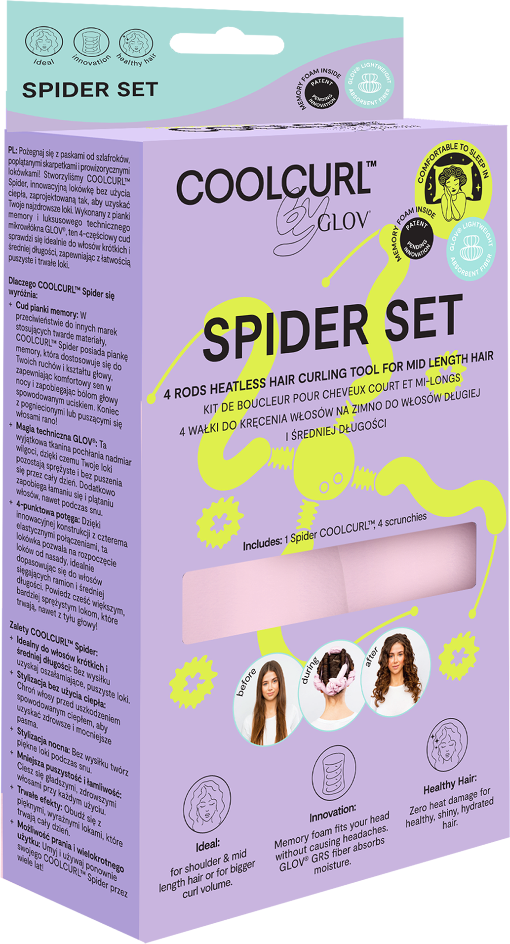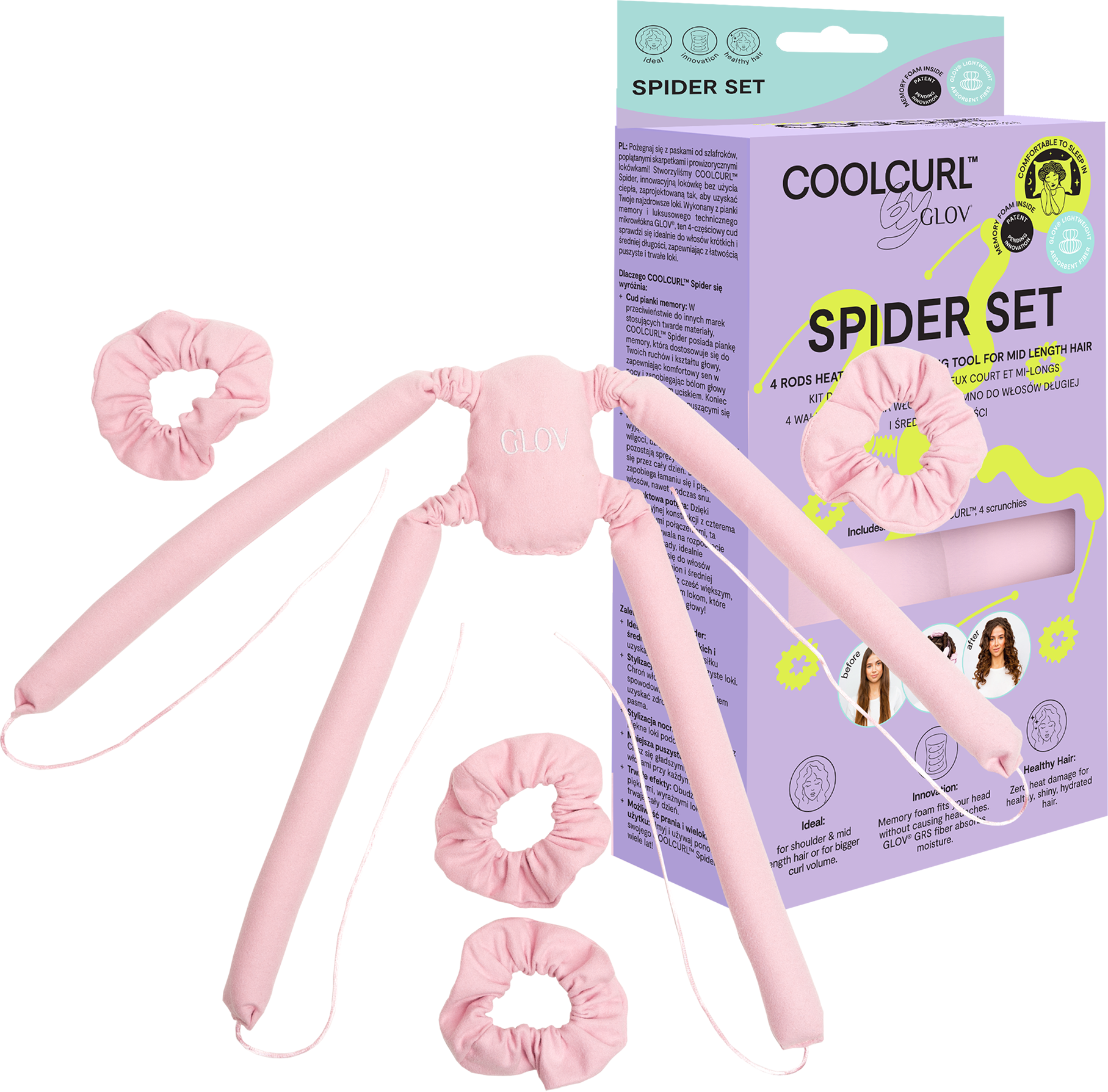 A COOLCURL™ Spider optimalizált kialakítása lehetővé teszi, hogy hő nélkül is könnyedén készítsen loknikat. Kifejezetten rövidebb és vékonyabb hajra lett kifejlesztve. Memóriahabból álló magja kíméletes a hajhoz és különösen kényelmes alváshoz - könnyedén alkalmazkodik a fejformához és a mozgásokhoz, miközben helyén tartja a hajat. A memóriahab-magot körülvevő, kellemes mikroszál különösen kíméletes a hajhoz, valamint ellensúlyozza a szöszösödést és a nemkívánatos töredezést.
