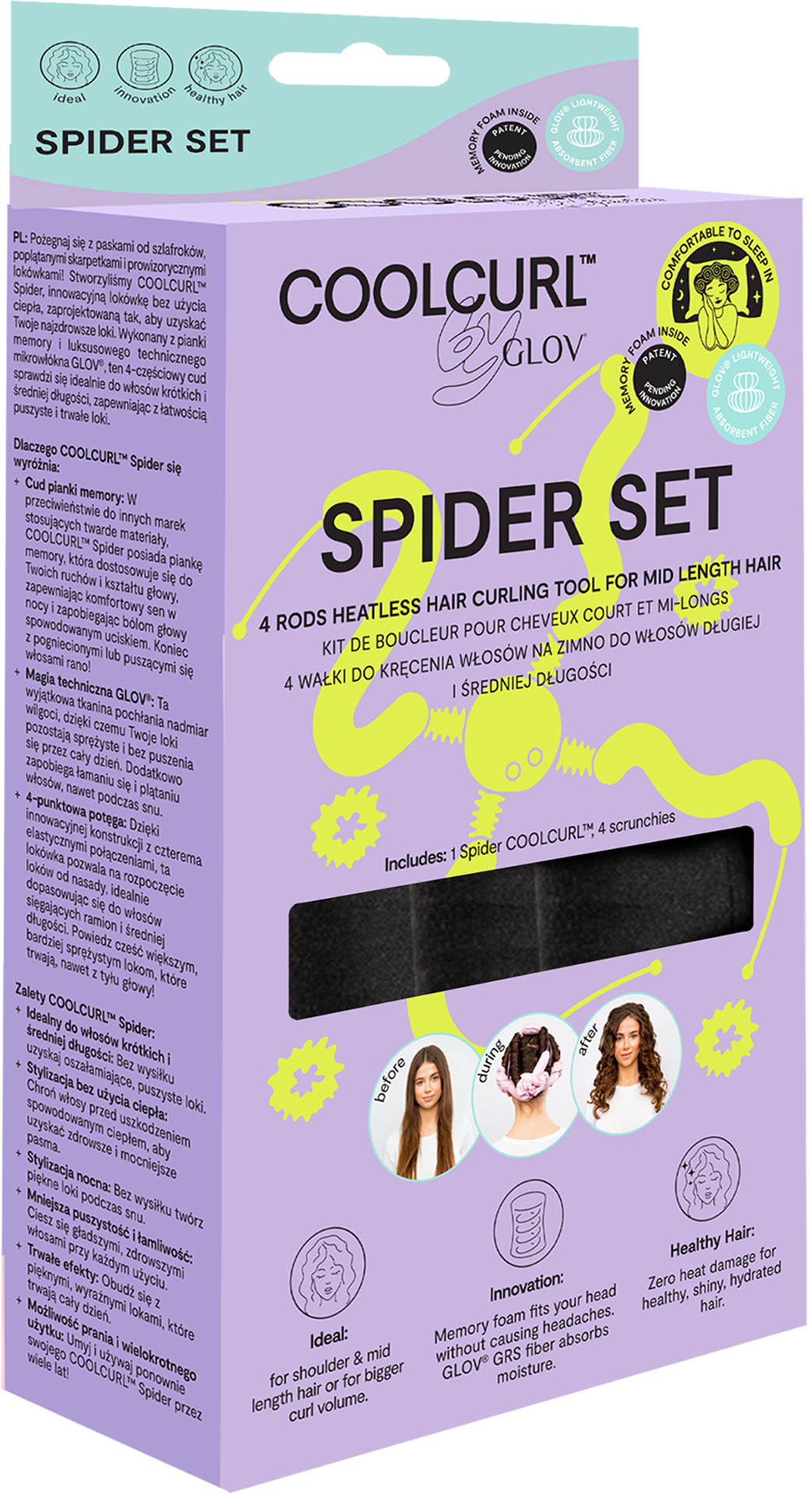 A COOLCURL™ Spider optimalizált kialakítása lehetővé teszi, hogy hő nélkül is könnyedén készítsen loknikat. Kifejezetten rövidebb és vékonyabb hajra lett kifejlesztve. Memóriahabból álló magja kíméletes a hajhoz és különösen kényelmes alváshoz - könnyedén alkalmazkodik a fejformához és a mozgásokhoz, miközben helyén tartja a hajat. A memóriahab-magot körülvevő, kellemes mikroszál különösen kíméletes a hajhoz, valamint ellensúlyozza a szöszösödést és a nemkívánatos töredezést.