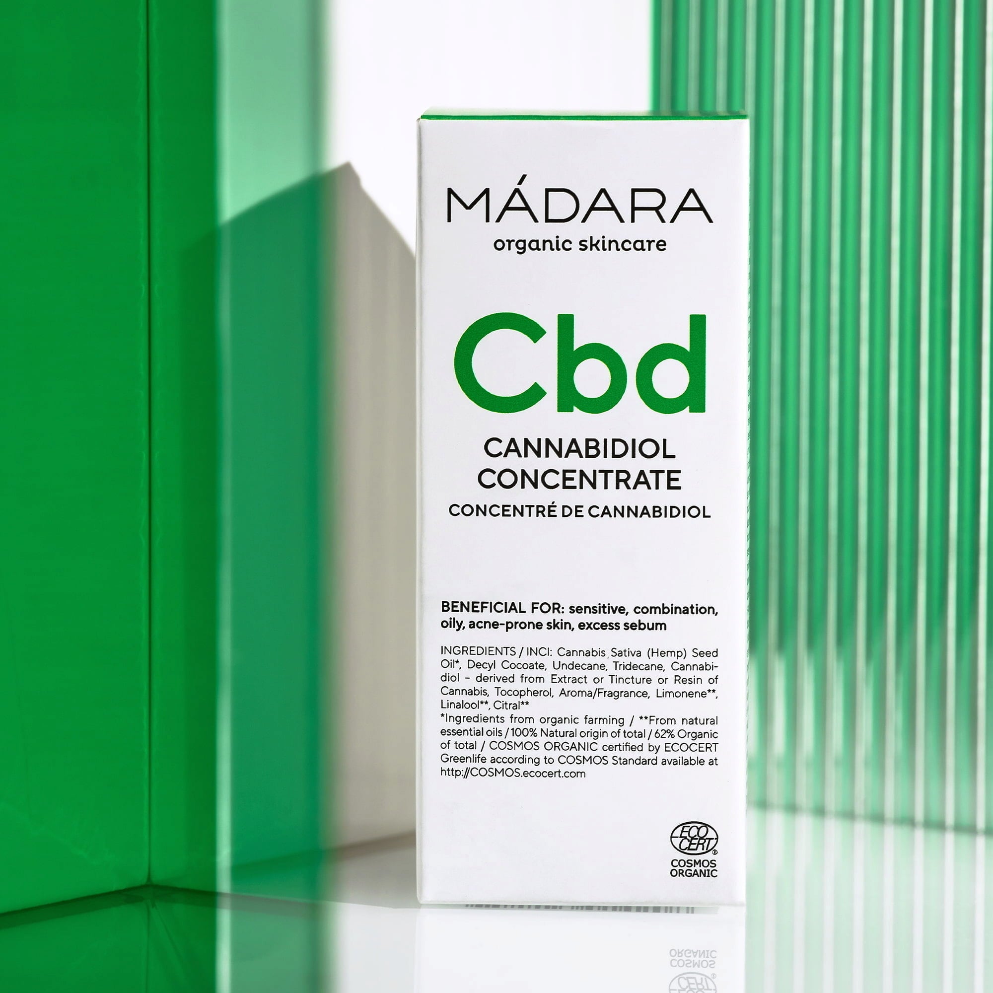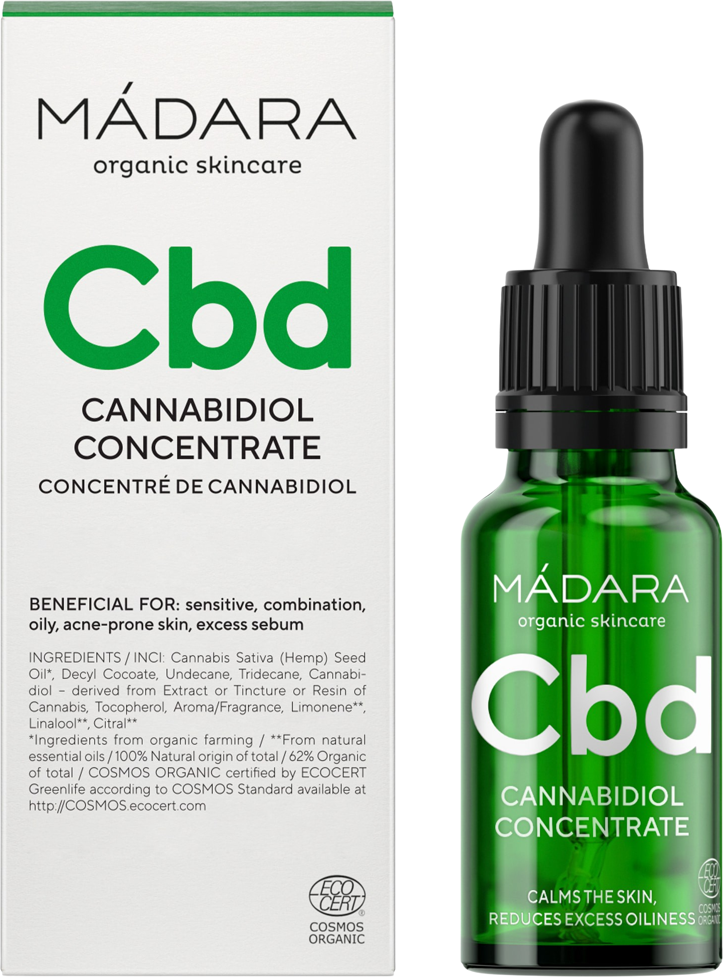 A MÀDARA Custom Actives Cannabidiol koncentrátuma természetes CBD-t tartalmaz, hogy ápolja és táplálja a problémás bőrtípusokat. Különösen a kombinált, zsíros, érzékeny, aknéra hajlamos bőrtípusok igényelnek kiegészítő ápolást. A Cannabidiol-szérum pontosan erre alkalmas: kiegyensúlyozó, seboreguleáló és intenzíven ápoló tulajdonságokat biztosít a megszokott krém kiegészítéseként.
