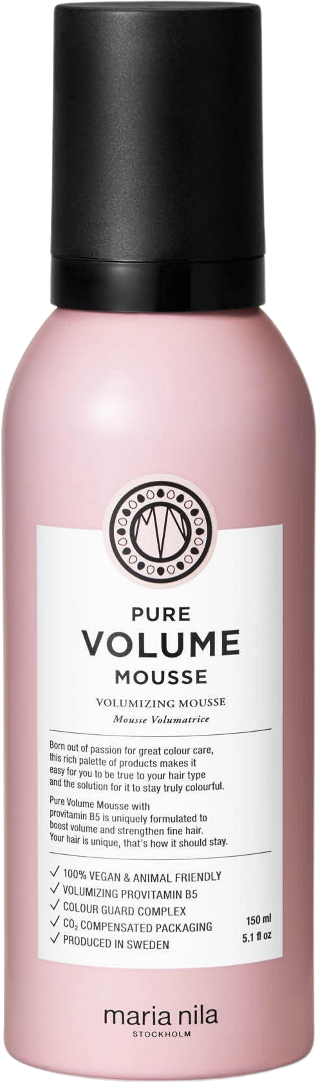 A Pure Volume Mousse a Maria Nila-tól gazdagítva van a provitamin B5-tel, amely valódi volumen-növelő csoda, ami nemcsak elképesztő teltséget és erőt, hanem ellenállhatatlan puhaságot ad hajának - mindezt hosszan tartó eredménnyel. Ezenkívül a hab csökkenti a statikus feltöltődést és extra védelmet nyújt a hajszárítás során. Annak érdekében, hogy hajszíne olyan élénk maradjon, mint az első napon, tartalmazza a Colour Guard Complex-et, amely hatékonyan védi haját az UV-sugaraktól, és hosszabban tartó ragyogó színintenzitást biztosít.
