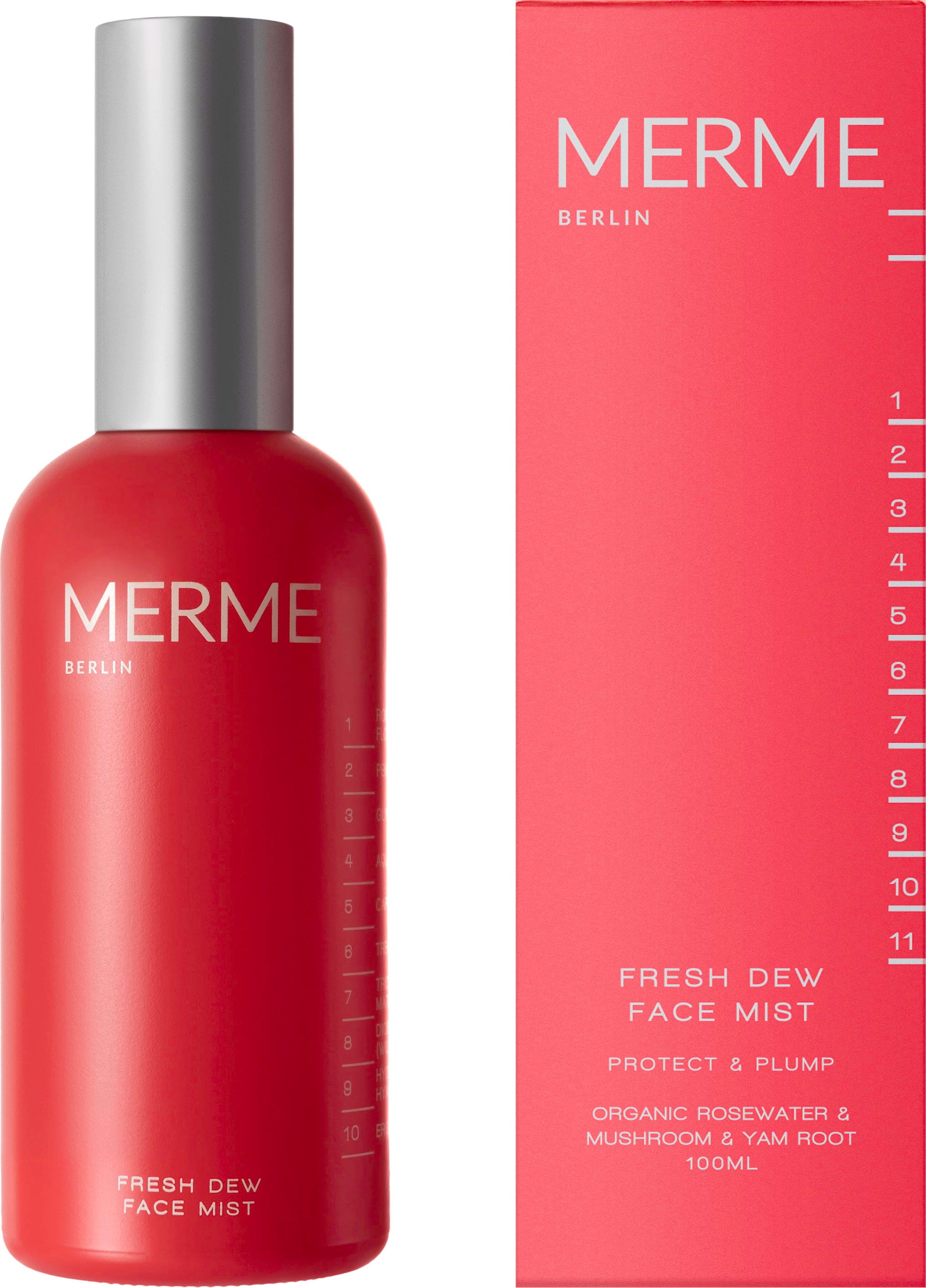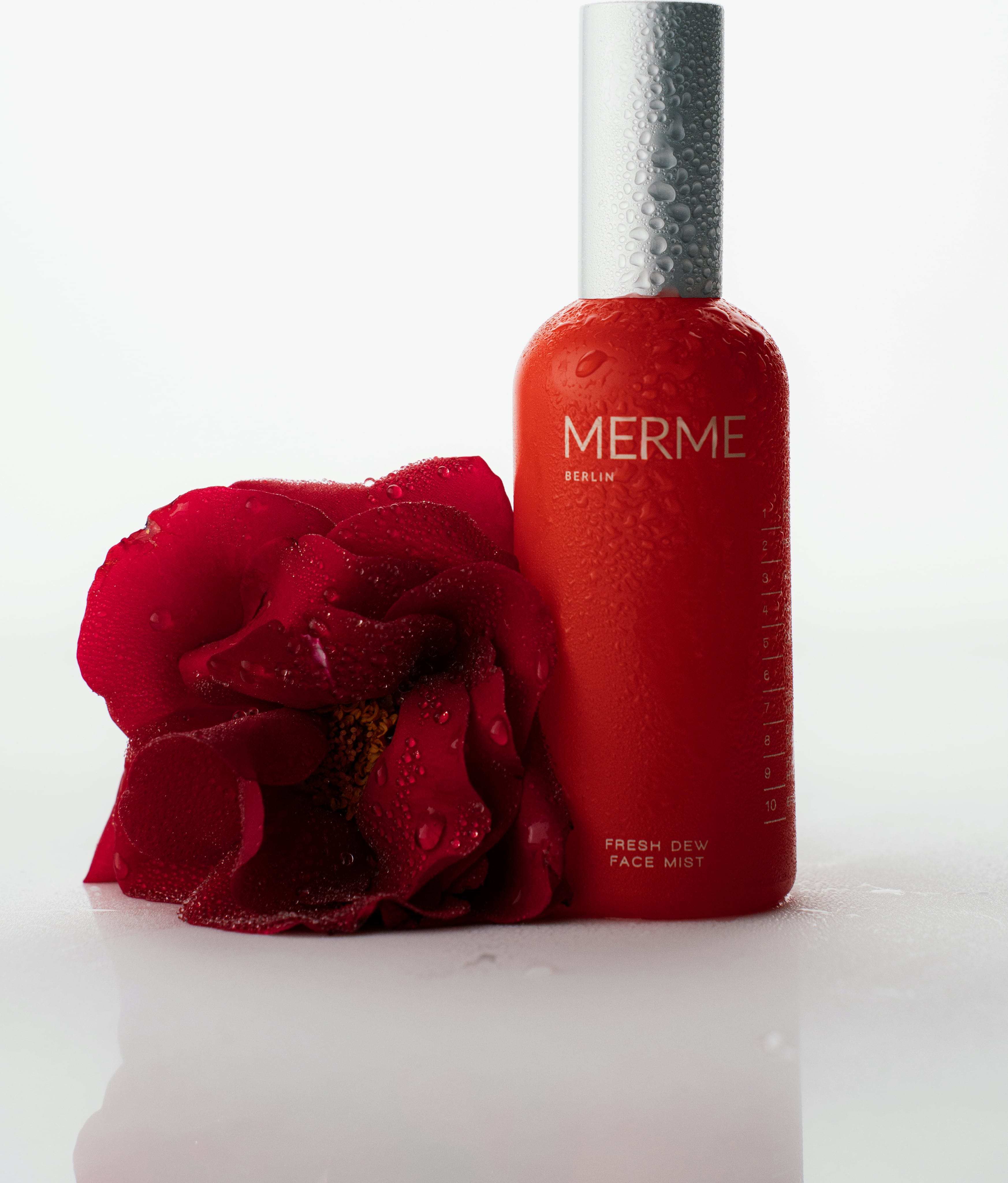 A MERME Berlin Fresh Dew Face Mist azonnali frissítő hatást nyújt a mindennapok során, amely pillanatok alatt revitalizálja és világosabbá teszi az arcszínt. A tiszta bio rózsavíz alap értékes hidratációt biztosít, megnyugtatja a bőrt, és csodálatosan kiegyensúlyozott bőrképet eredményez. Különleges összetevője a ritka Matsutake-kivonat, amely erős antioxidáns tulajdonságaival véd a külső behatásoktól, és egyenletes ragyogást kölcsönöz az arcszínnek. A receptúrát jamgyökér egészíti ki, amely hatékonyan köti meg a nedvességet, és támogatja a bőr rugalmasságát. Így az arc azonnal teltebbnek, puhábbnak és tökéletesen ápoltnak tűnik. Legyen szó a rutin előkészítéséről vagy a smink feletti élénkítő permetről – ez a spray bármikor harmatosan friss finisht biztosít.