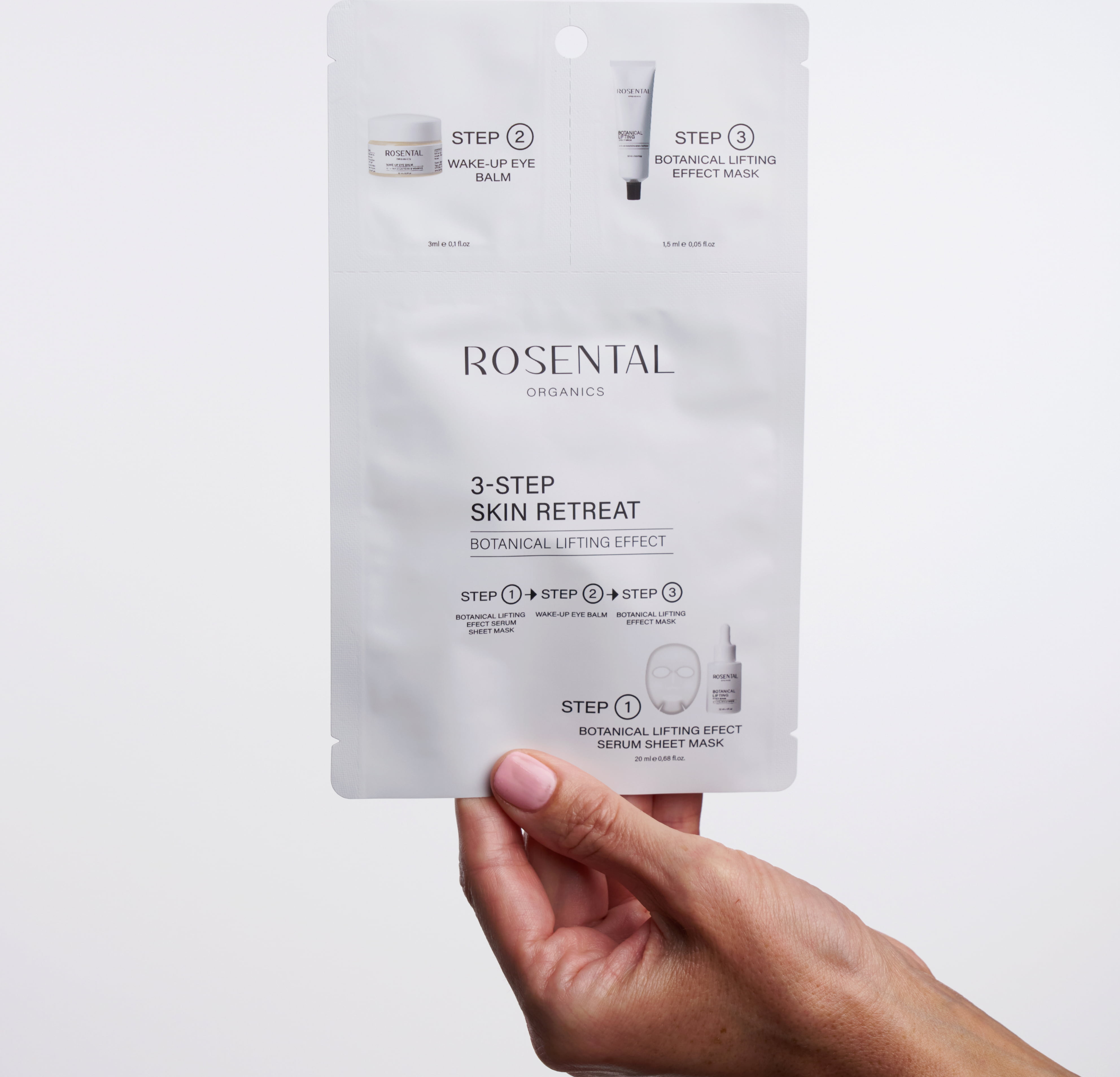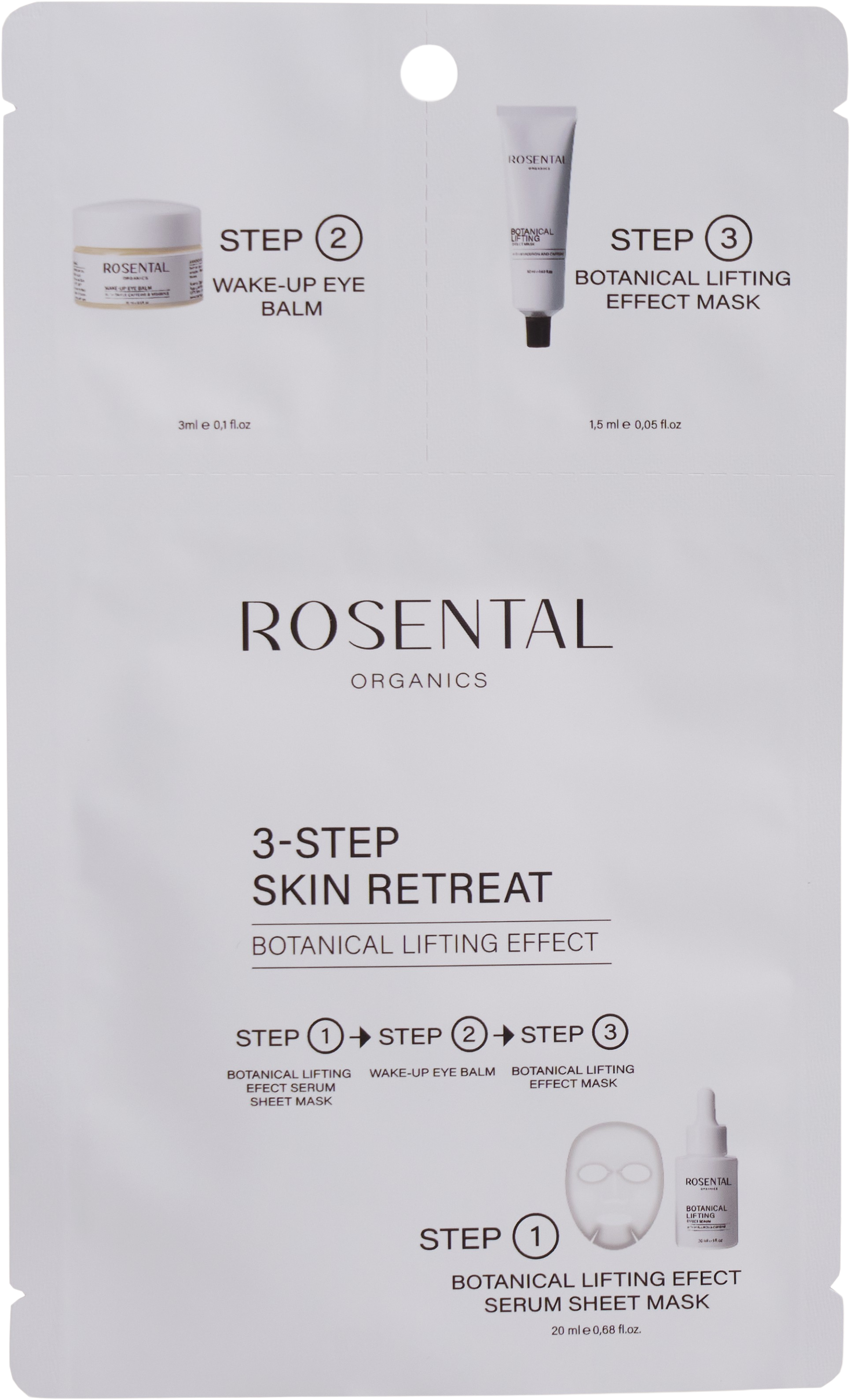 Ez a háromlépéses intenzív ápoló kezelés exkluzív, egyszer használatos alkalmazást kínál maximális hatással. Ideális intenzív szépségápolási kezelésként utazáshoz vagy a Rosental legkelendőbb termékeinek felfedezéséhez. A tasak három terméket tartalmaz, amelyek szinergikusan működnek a simább bőr, a felfrissült szemek és a lifting hatás érdekében. Felhasználás: