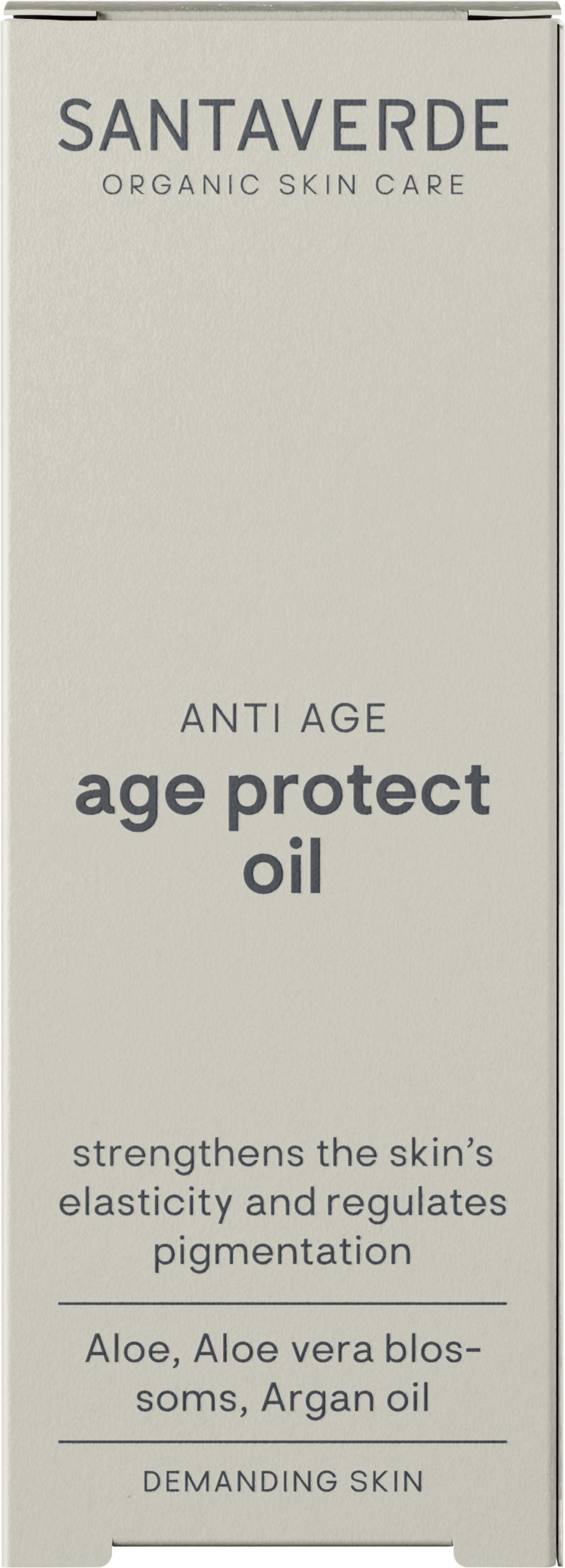 A finom Age Protect olaj felépítő lipidekkel látja el a bőrt, rugalmasságot biztosít és segít az öregedés jeleinek megelőzésében. Az argán gyümölcsökből, sárgabarackból és bogáncsból származó értékes magolajok erősítik a természetes védőgát funkcióit, csökkentik a szárazráncokat és javítják a bőr rugalmasságát. Az antioxidatív aloe vera virágok védelmet nyújtanak a szabad gyökök káros hatásai ellen. A kiváló minőségű gyökér kivonatokból származó hatóanyagok komplexe láthatóan kiegyenlíti a túlzott pigmentációt. Az olaj selymes textúrájú és azonnal felszívódik, sima és egyenletes arcszínt biztosít. Különösen alkalmas igényes, száraz és érzékeny bőrre.