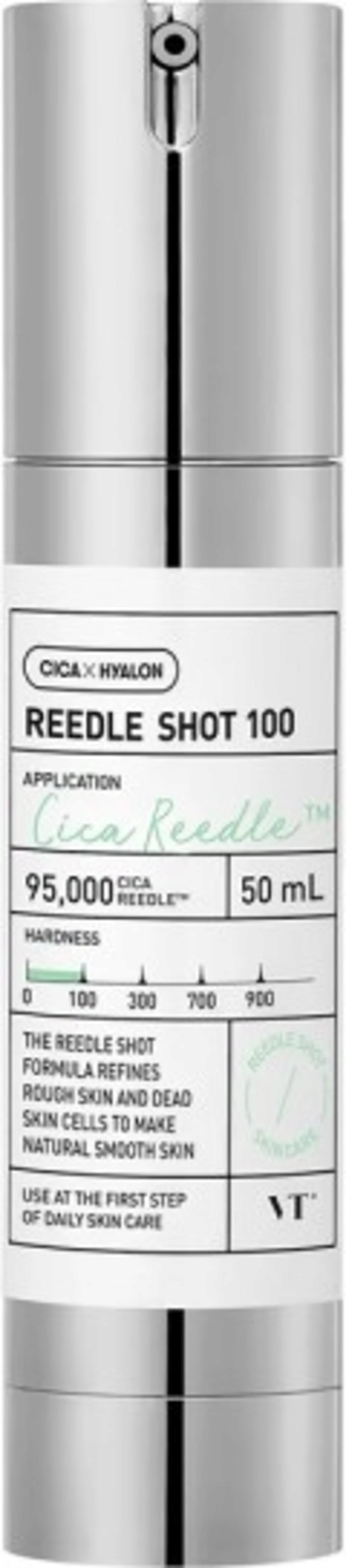 A Reedle Shot 100 a VT Cosmetics-től ideális az első lépésként - a „Zero Step” - a mindennapi bőrápolási rutinodban, hogy megközelítsd a népszerű üvegbőr hatást. Támogatja a bőr természetes megújulási folyamatát, eltávolítja az elhalt hámsejteket, és elősegíti a hosszú idő alatt felhalmozódott szennyeződések gyengéd eltávolítását. Közben a bőr textúrája is kisimul és finomodik, valamint a pigmentáció vagy pattanásnyomok által okozott sötét foltok is világosodnak. A formuláció a mikrotűszerű Cica Reedle™-re épül, amely mikroszkopikus méretű ásványi részecskékből áll. Ez segíti a bőrápoló termékek felszívódását is. A Cica-kivonattal és alacsony molekulasúlyú hialuronsavval a hipoallergén, nem komedogén Reedle Shot 100 nyugtató és hidratáló ápolást nyújt, és minden bőrtípusra, így érzékeny bőrre is alkalmas.
